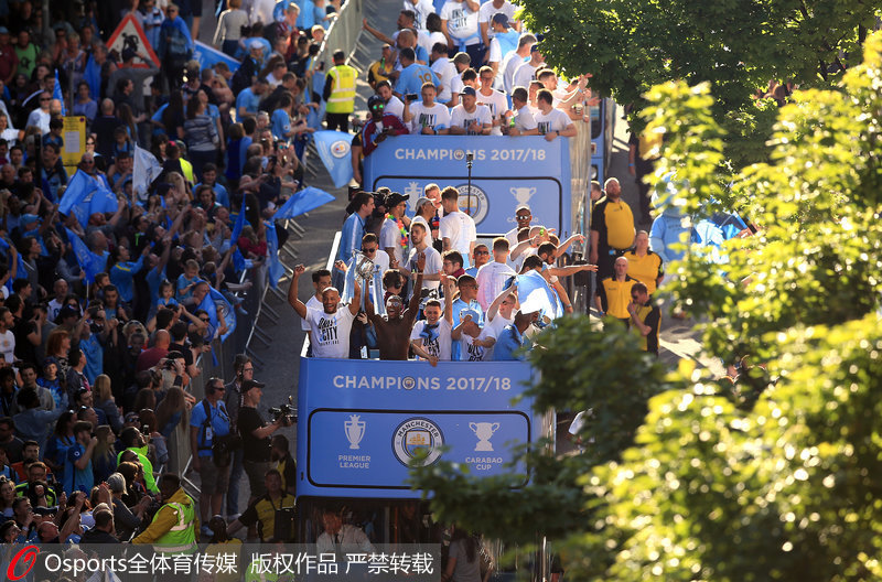 人民网5月15日电 北京时间5月15日,曼城俱乐部举行夺冠游行,万人空巷场面盛大。本赛季英超联赛,曼城最终以32胜4平2负积100分,打进106球夺冠,打破了英超单赛季胜场次数、进球和积分纪录,同时成为英超历史上第一支单赛季积分达到100分的球队。(Osports全体育传媒 版权作品 严禁转载)