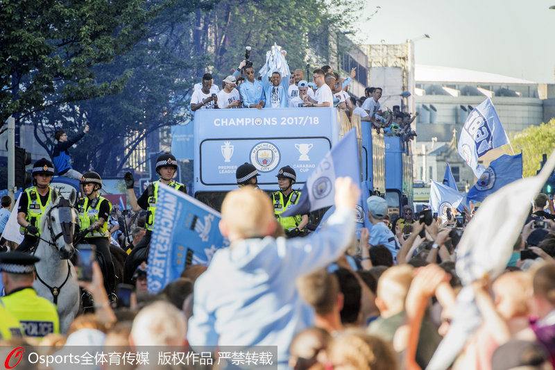 人民网5月15日电 北京时间5月15日,曼城俱乐部举行夺冠游行,万人空巷场面盛大。本赛季英超联赛,曼城最终以32胜4平2负积100分,打进106球夺冠,打破了英超单赛季胜场次数、进球和积分纪录,同时成为英超历史上第一支单赛季积分达到100分的球队。(Osports全体育传媒 版权作品 严禁转载)