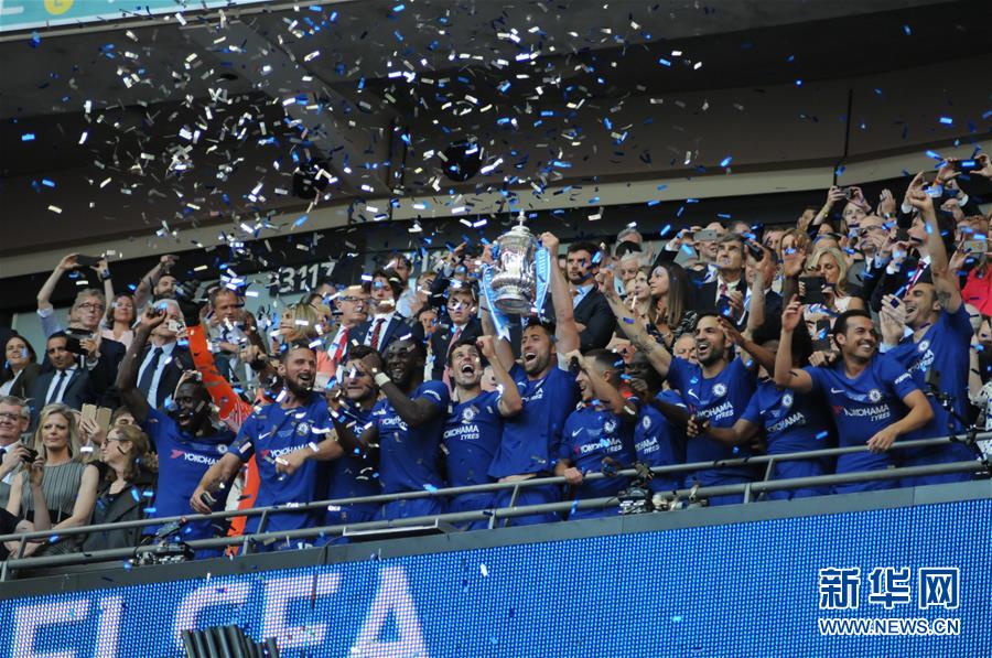 ↑5月19日,切尔西队在颁奖仪式上庆祝。当日,在2017-2018赛季英格兰足总杯决赛中,切尔西队以1比0战胜曼联队,获得冠军。 新华社记者王子江摄