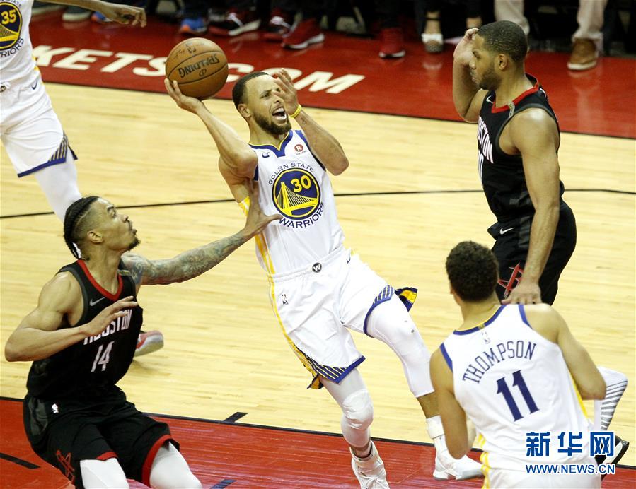 ↑5月28日,勇士队球员库里(左二)在比赛中进攻。当日,在2017-2018赛季NBA季后赛西部决赛第七场比赛中,金州勇士队客场101比92战胜休斯敦火箭队,以总比分4比3晋级总决赛。新华社发(宋穹摄)