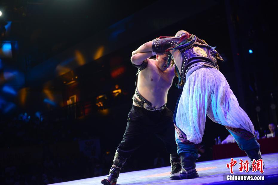 6月2日晚,日本选手星凤对阵戴有景嘎绸缎的中国搏克手孟和都楞。当日,2018年度“草原情·哈萨尔搏克争霸赛”在位于内蒙古呼和浩特的乌兰恰特剧院开赛。赛制安排为“车轮战”:实力跤王孟和都楞连续挑战7名搏克手,来自日本的星凤也是7名之一。最终孟和都楞获得7连胜。中新社记者 刘文华 摄