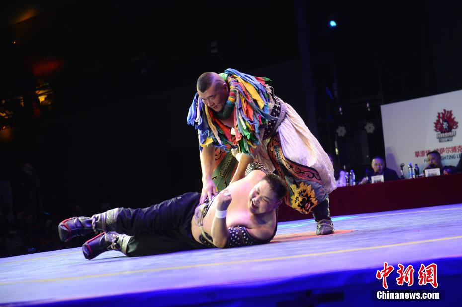 6月2日晚,日本选手星凤对阵戴有景嘎绸缎的中国搏克手孟和都楞,星凤倒地。当日,2018年度“草原情·哈萨尔搏克争霸赛”在位于内蒙古呼和浩特的乌兰恰特剧院开赛。赛制安排为“车轮战”:实力跤王孟和都楞连续挑战7名搏克手,来自日本的星凤也是7名之一。最终孟和都楞获得7连胜。中新社记者 刘文华 摄