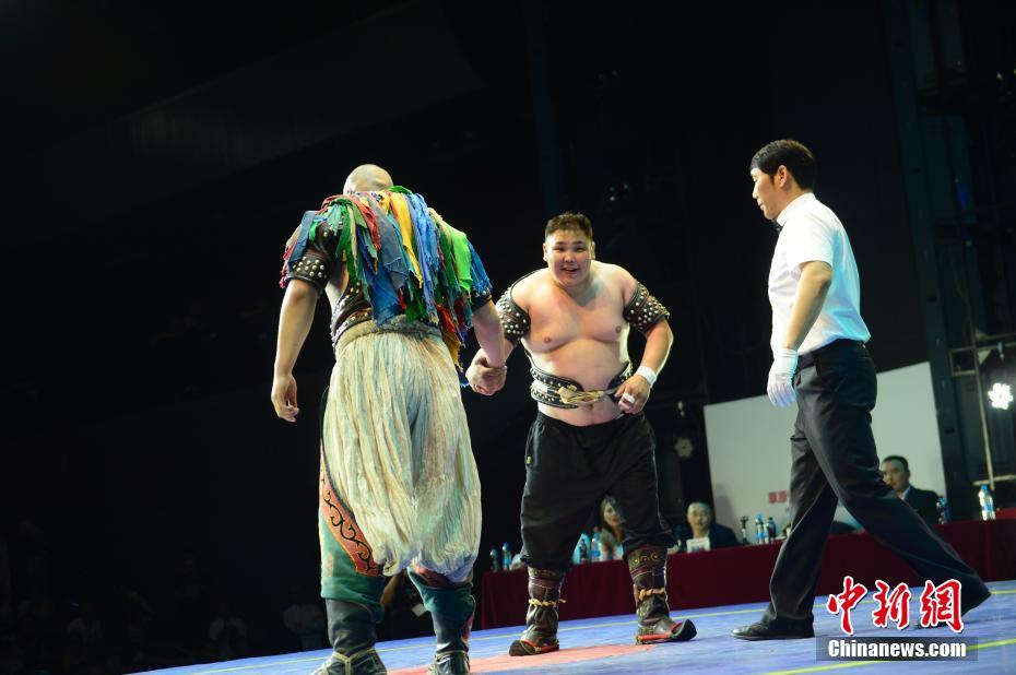 6月2日晚,日本选手星凤对阵戴有景嘎绸缎的中国搏克手孟和都楞,赛后双方握手致意。当日,2018年度“草原情·哈萨尔搏克争霸赛”在位于内蒙古呼和浩特的乌兰恰特剧院开赛。赛制安排为“车轮战”:实力跤王孟和都楞连续挑战7名搏克手,来自日本的星凤也是7名之一。最终孟和都楞获得7连胜。中新社记者 刘文华 摄
