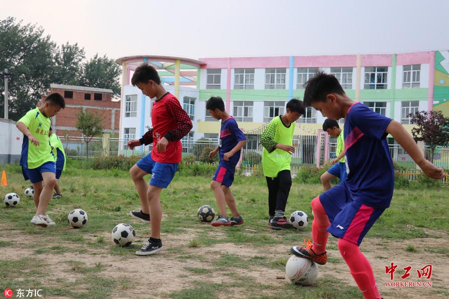 2018年6月3日,安徽阜阳。王侠是阜阳市颍泉区一名乡村女教师。2014年,在学校和社会各界帮助下,她组建了一支以留守儿童和孤儿为主的小学生足球队,并数次到省内外参加比赛,均获得较好成绩。而她也被孩子们亲切地称为“足球妈妈”。从学校毕业器,他便扎根最基层一线教育,这一干就是整整24年。如今,在她的努力下,越来越多当地的孩子了解足球,爱上足球。2018年4月10日,意大利国际米兰足球俱乐部、爱德基金会、苏宁集团等一行人十余人专程到阜阳三义学校考察校园足球。汇报中体育老师王侠的“用奋斗成就未来,让足球点燃梦想”的事迹,赢得了国内外友人的点赞。东方IC版权图片,请勿转载。