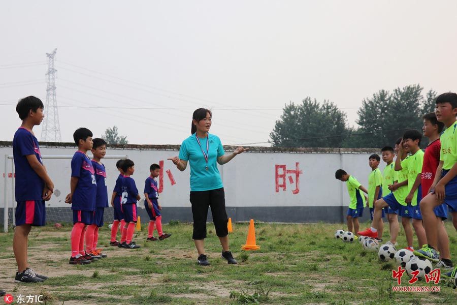 2018年6月3日,安徽阜阳。王侠是阜阳市颍泉区一名乡村女教师。2014年,在学校和社会各界帮助下,她组建了一支以留守儿童和孤儿为主的小学生足球队,并数次到省内外参加比赛,均获得较好成绩。而她也被孩子们亲切地称为“足球妈妈”。从学校毕业器,他便扎根最基层一线教育,这一干就是整整24年。如今,在她的努力下,越来越多当地的孩子了解足球,爱上足球。2018年4月10日,意大利国际米兰足球俱乐部、爱德基金会、苏宁集团等一行人十余人专程到阜阳三义学校考察校园足球。汇报中体育老师王侠的“用奋斗成就未来,让足球点燃梦想”的事迹,赢得了国内外友人的点赞。东方IC版权图片,请勿转载。