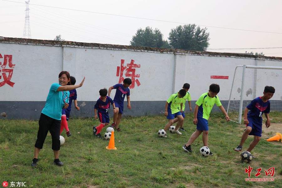 2018年6月3日,安徽阜阳。王侠是阜阳市颍泉区一名乡村女教师。2014年,在学校和社会各界帮助下,她组建了一支以留守儿童和孤儿为主的小学生足球队,并数次到省内外参加比赛,均获得较好成绩。而她也被孩子们亲切地称为“足球妈妈”。从学校毕业器,他便扎根最基层一线教育,这一干就是整整24年。如今,在她的努力下,越来越多当地的孩子了解足球,爱上足球。2018年4月10日,意大利国际米兰足球俱乐部、爱德基金会、苏宁集团等一行人十余人专程到阜阳三义学校考察校园足球。汇报中体育老师王侠的“用奋斗成就未来,让足球点燃梦想”的事迹,赢得了国内外友人的点赞。 东方IC版权图片,请勿转载。