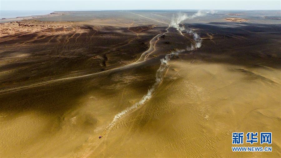 ↑6月5日,赛车行驶在戈壁赛段。当日,2018中国环塔(国际)拉力赛在新疆鄯善县境内展开第三赛段角逐。赛段全长约327公里。 新华社记者江文耀摄