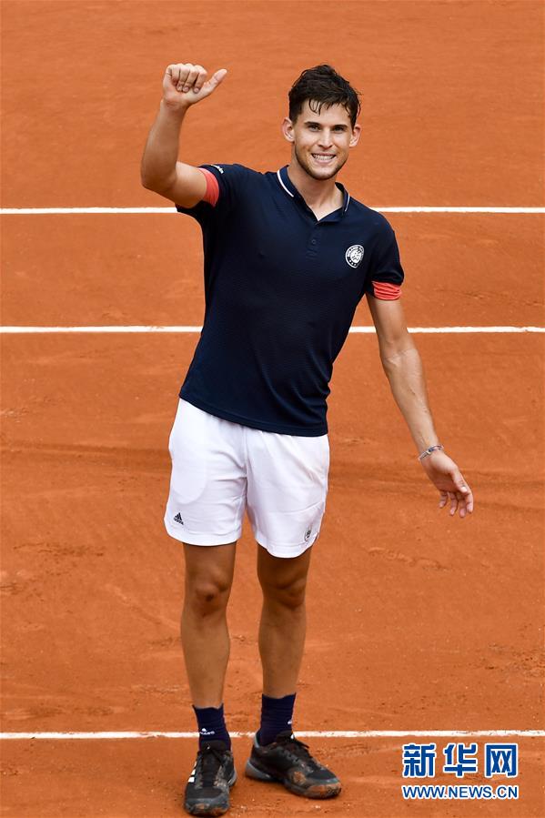 ↑6月5日,奥地利选手蒂姆庆祝胜利。当日,在法国巴黎进行的2018法国网球公开赛男子单打四分之一决赛中,奥地利选手蒂姆以3比0战胜德国选手兹维列夫,晋级四强。新华社记者陈益宸摄