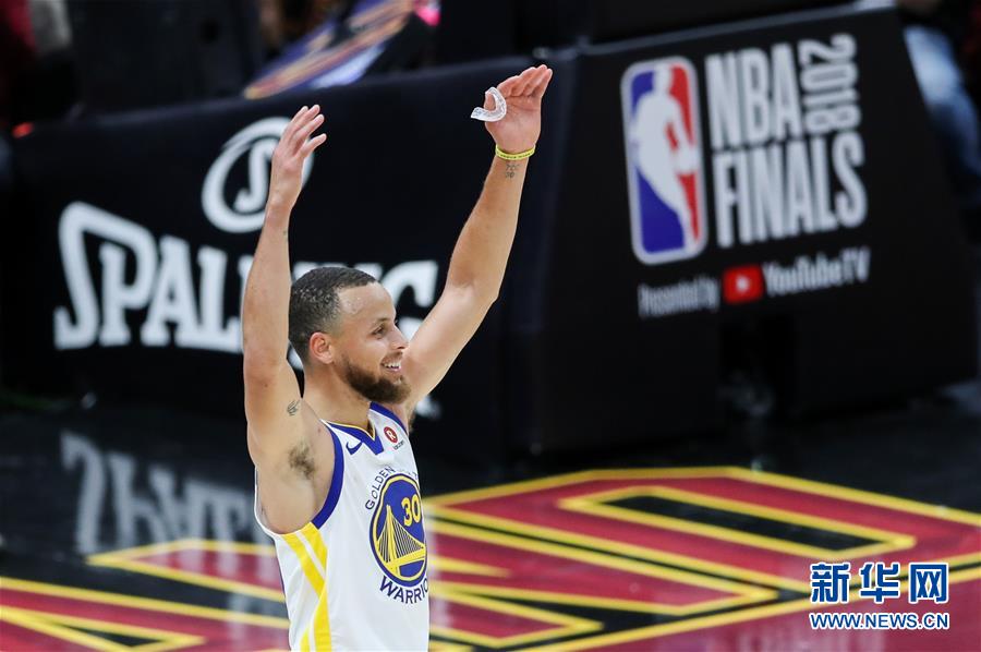 ↑6月6日,勇士队球员库里(中)在比赛中。当日,在2017-2018赛季NBA总决赛第三场比赛中,金州勇士队客场以110比102战胜克利夫兰骑士队,总比分3比0领先。新华社记者王迎摄