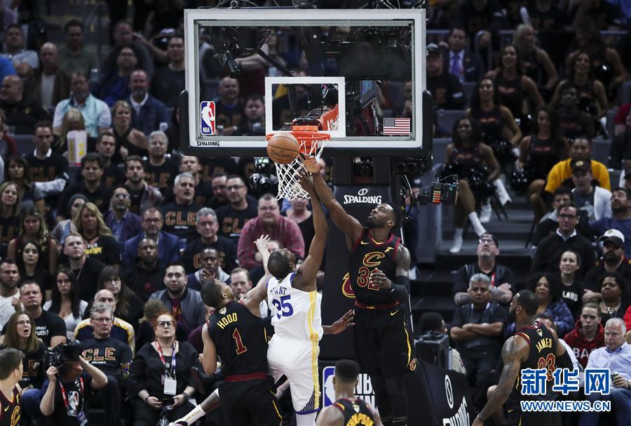 ↑6月6日,骑士队球员杰夫·格林(上右)在比赛中封盖勇士队球员杜兰特上篮。新华社记者王迎摄