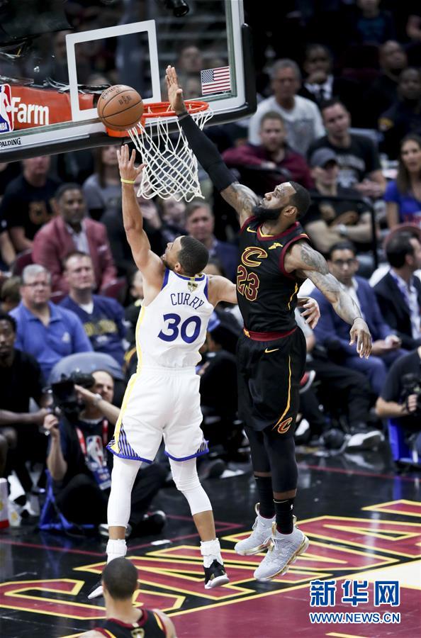 ↑6月6日,骑士队球员詹姆斯(右)在比赛中防守勇士队球员库里上篮。新华社记者王迎摄
