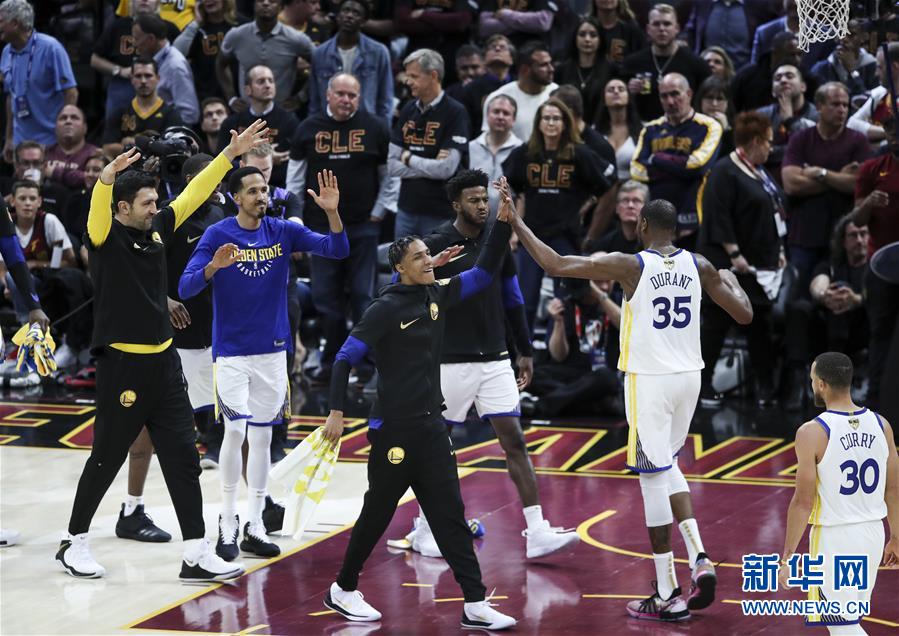 ↑6月6日,勇士队球员在比赛中间歇庆祝领先。新华社记者王迎摄