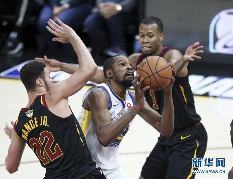 ↑6月6日,勇士队球员杜兰特(中)在比赛中上篮。新华社记者王迎摄