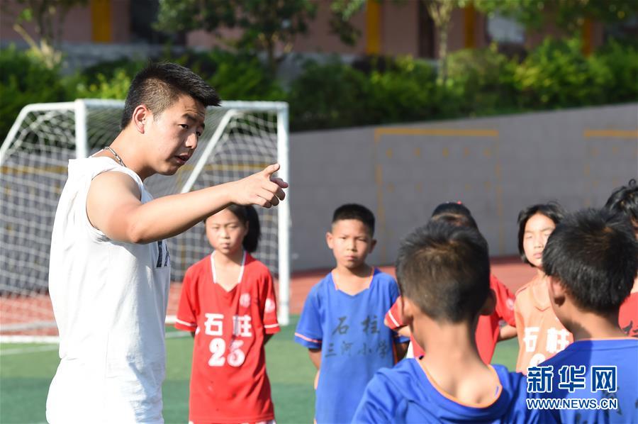 ↑6月6日,三河镇小学足球队教练李桂航(左一)对小球员进行技术指导。新华社记者唐奕摄