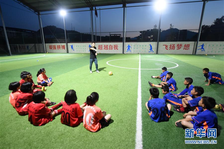 ↑6月6日,三河镇小学足球队教练李桂航(中)在风雨灯光球场内对小球员们进行技术指导。新华社记者唐奕摄