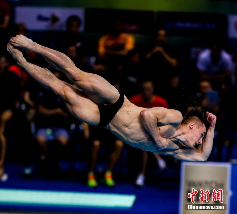 6月7日,2018年第21届跳水世界杯在武汉结束男子3米跳板的争夺,中国队包揽冠亚军。谢思埸决赛里发挥稳定,动作质量高,以557.60分夺冠,曹缘以544.60分获得亚军。英国选手杰克·拉夫尔以515.00获得季军。图为获得季军的英国选手杰克·拉夫尔在比赛中。中新社记者 张畅 摄