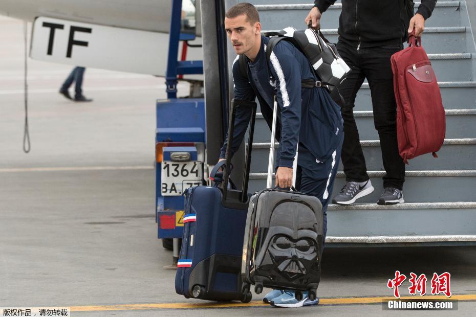 法国队乘机抵达莫斯科谢列梅捷沃国际机场,法国球星格里兹曼的一个星球大战主题的拉杆箱引人注目。