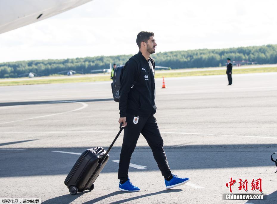 乌拉圭队乘机抵达下诺夫哥罗德国际机场,当家球星苏亚雷斯拉着行李箱走出机场。
