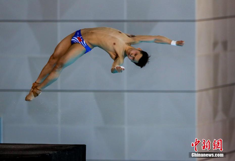 6月10日傍晚,第21届国际泳联跳水世界杯在武汉体育中心游泳馆结束了第7比赛日。在男子十米跳台争夺中,中国选手包揽冠亚军,陈艾森夺得冠军,杨健获得亚军,美国选手丁斯摩尔获得第三。图为中国选手陈艾森在比赛中。中新社记者 张畅 摄