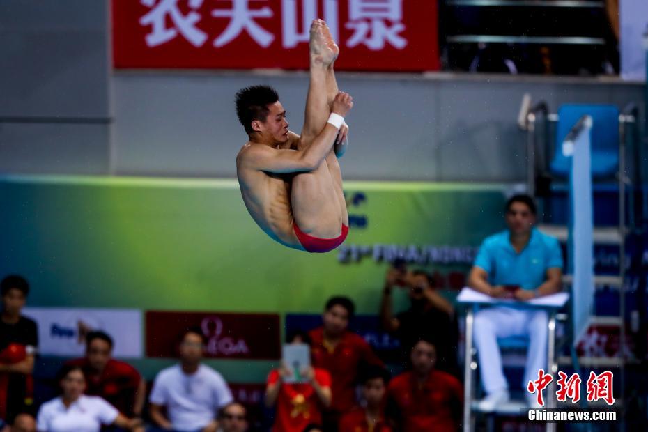 6月10日傍晚,第21届国际泳联跳水世界杯在武汉体育中心游泳馆结束了第7比赛日。在男子十米跳台争夺中,中国选手包揽冠亚军,陈艾森夺得冠军,杨健获得亚军,美国选手丁斯摩尔获得第三。图为中国选手杨健在比赛中。中新社记者 张畅 摄