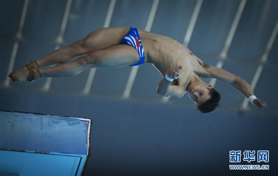 ↑6月10日,陈艾森在比赛中。当日,在武汉进行的第21届国际泳联跳水世界杯男子十米跳台决赛中,中国选手陈艾森以557.80分的总成绩夺冠。 新华社记者肖艺九摄