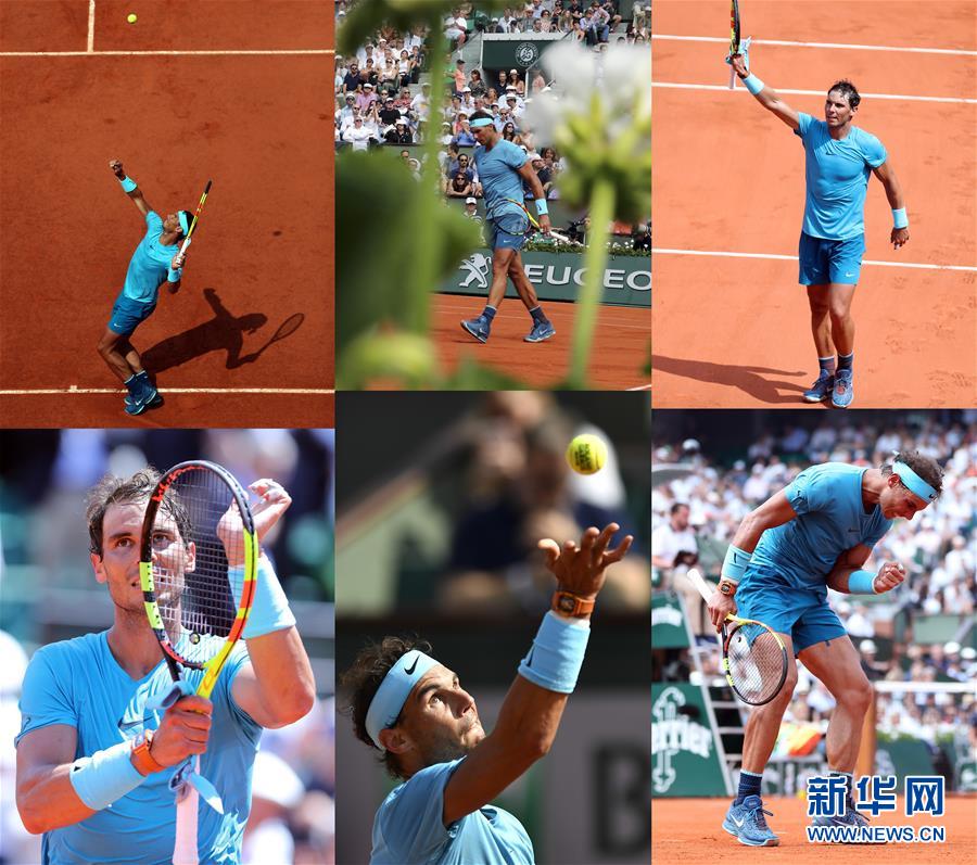 6月11日,在法国巴黎举行的2018法国网球公开赛男子单打决赛中,西班牙选手纳达尔以3比0战胜奥地利选手蒂姆,夺得冠军,捧起个人第十一座“火枪手杯”,由此成为公开赛时代首位在一项大满贯赛事中11次夺冠的选手。图为纳达尔在2018年法网男单各阶段比赛中(拼版照片)。 新华社记者罗欢欢、陈益宸摄
