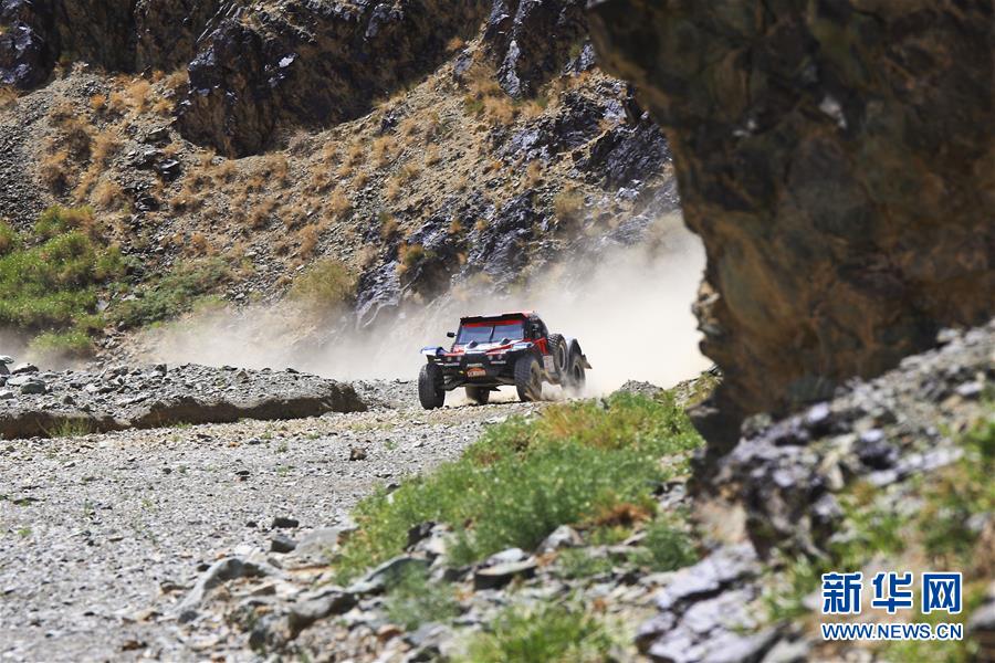 ↑6月11日,来自硬虎赛车俱乐部车手候外牛与领航员刘胜驾驶赛车在河谷间穿行。新华社记者江文耀摄