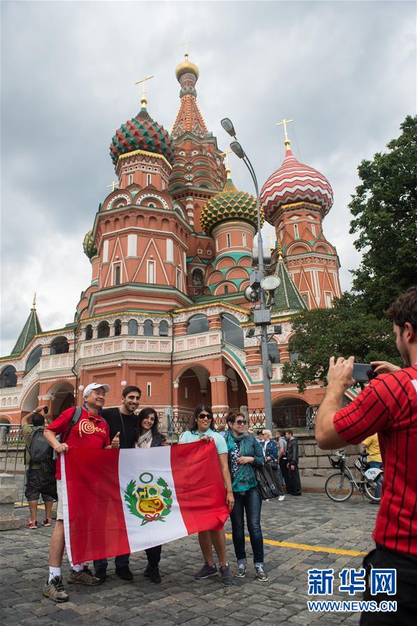 ↑6月11日,球迷在红场合影留念。第21届世界杯足球赛开幕在即,在举办城市之一的莫斯科,许多球迷在街头观光、合影留念。 新华社记者杜宇摄