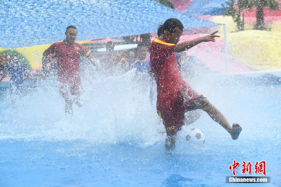 6月12日,2018年俄罗斯世界杯即将开幕,重庆洋人街水上乐园举行了一场为世界杯加油助威的足球互动赛事,吸引了不少游客前来参加。中新社记者 陈超 摄