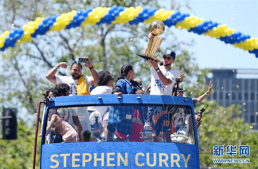 ↑6月12日,库里(前右)高举奖杯参加巡游。当日,2017-2018赛季NBA总冠军金州勇士队在奥克兰举行盛大游行和集会,庆祝四年来第三次夺得NBA总冠军。 新华社记者吴晓凌摄