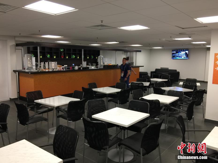 当地时间6月13日,记者探访俄罗斯世界杯媒体注册中心。图为卢日尼基体育场内媒体休息室。中新社记者 富田 摄