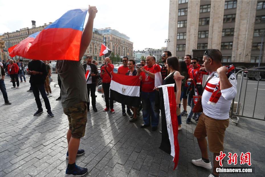 俄罗斯球迷(左)与埃及球迷们(右)在场外“对峙”。 中新社记者 富田 摄