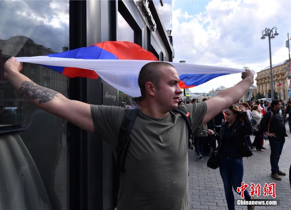 图为俄罗斯球迷高举国旗。 中新社记者 毛建军 摄