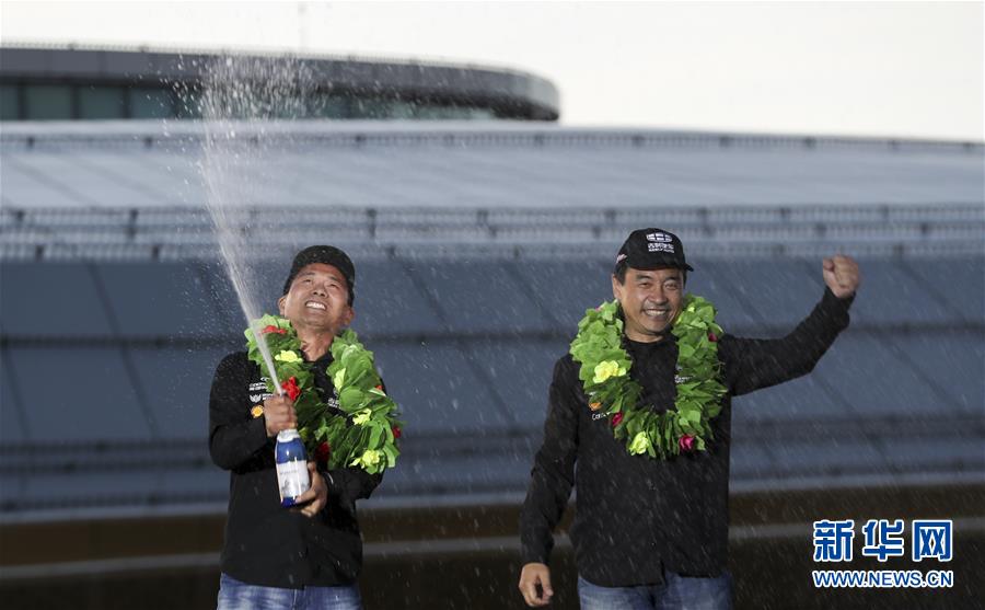 ↑6月13日,韩魏(左)与领航员廖岷在领奖台上喷洒香槟庆祝。当日,2018中国环塔(国际)拉力赛完成全部赛段竞逐,在新疆维吾尔自治区乌鲁木齐市正式收官。吉利汽车固铂轮胎车队韩魏/廖岷(领航员)夺得汽车组冠军。 新华社记者江文耀摄