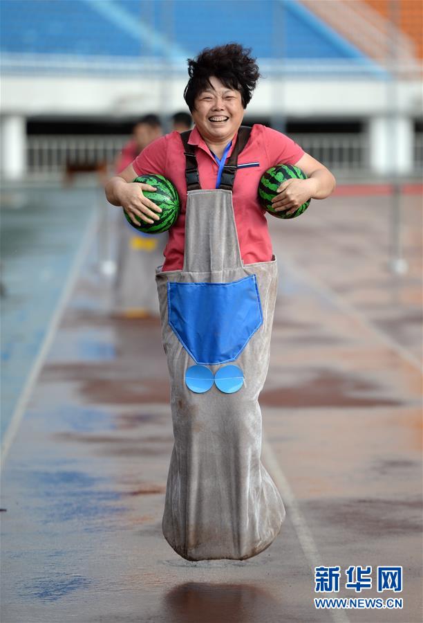 ↑6月13日,一名选手在“袋鼠运瓜”项目比赛中。当日,在西安市陕西省体育场举行的陕西省第十六届运动会上,参赛选手们参加了一场趣味田径比赛。 新华社记者李一博摄