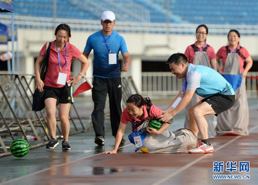 ↑6月13日,一名选手在“袋鼠运瓜”项目比赛中跌倒。 新华社记者李一博摄