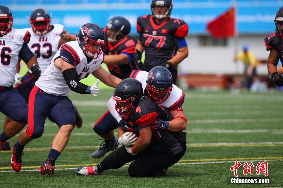 6月14日,2018世界大学生美式橄榄球锦标赛在哈尔滨拉开帷幕,这是世界大学生美式橄榄球第一次走进亚洲,在揭幕战上,中国队0比69负美国队。据了解,2018世界大学生美式橄榄球锦标赛于14日至24日在哈尔滨商业大学举行,来自中国、美国、墨西哥、韩国、日本5个国家的运动员参加。图为中国队与美国队比赛现场,中国队队员身穿蓝色球衣。中新社发 王立刚 摄