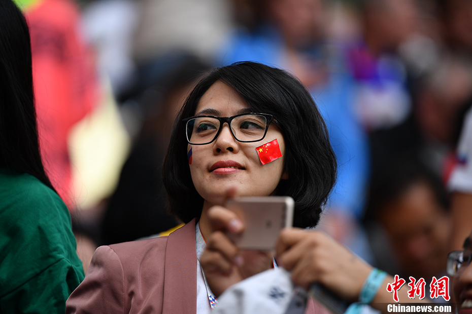 北京时间6月14日23点,俄罗斯世界杯揭幕战在莫斯科卢日尼基体育场打响,东道主俄罗斯对阵沙特阿拉伯。比赛现场,各国球迷俨然成为一道亮丽的风景线。 中新社记者 毛建军 摄