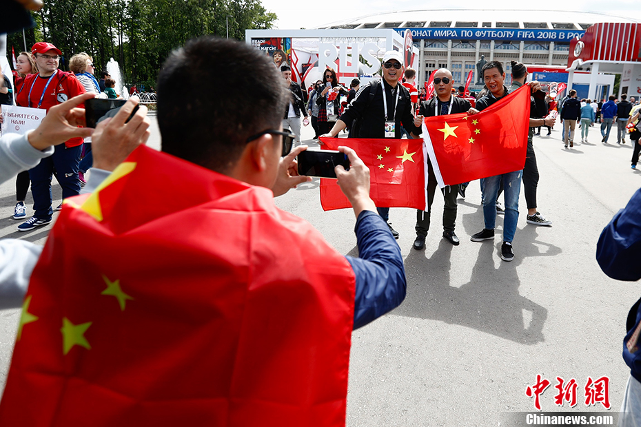 北京时间6月14日23点,俄罗斯世界杯揭幕战即将在莫斯科卢日尼基体育场打响,东道主俄罗斯对阵沙特阿拉伯。比赛开始前,各国球迷聚集在卢日尼基体育场外狂欢,热情高涨。图为身披中国国旗的球迷。 中新社记者 富田 摄