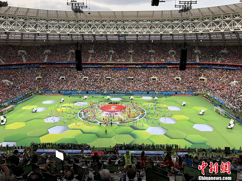 北京时间6月14日22点30分,俄罗斯世界杯开幕式在莫斯科卢日尼基体育场上演,这意味着四年一度的足球盛宴正式拉开帷幕。虽然开幕式表演时长不长但极具创意。开幕式结束后,北京时间23点,世界杯的揭幕战将也在这儿打响。在国际足联公布的俄罗斯世界杯开幕式表演嘉宾名单当中,除了有俄罗斯著名女高音歌唱家阿依达·嘉丽弗莉娜、英国著名流行歌手罗比·威廉姆斯外,还有两届世界杯冠军得主罗纳尔多。此外,在开幕式上,还有1561人表演团队练习颠球,该项目有望突破吉尼斯纪录。 中新社记者 王牧青 摄