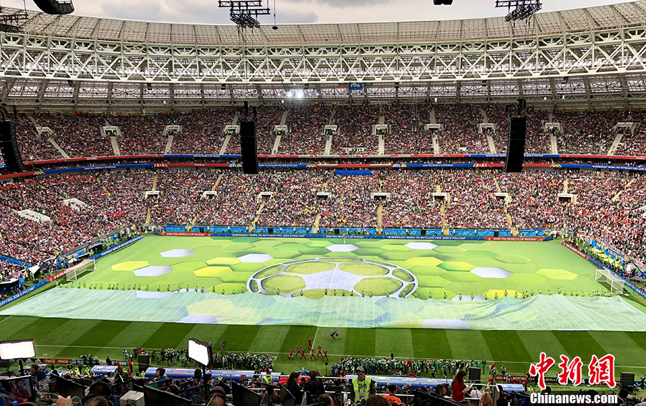 北京时间6月14日22点30分,俄罗斯世界杯开幕式在莫斯科卢日尼基体育场上演,这意味着四年一度的足球盛宴正式拉开帷幕。虽然开幕式表演时长不长但极具创意。开幕式结束后,北京时间23点,世界杯的揭幕战将也在这儿打响。在国际足联公布的俄罗斯世界杯开幕式表演嘉宾名单当中,除了有俄罗斯著名女高音歌唱家阿依达·嘉丽弗莉娜、英国著名流行歌手罗比·威廉姆斯外,还有两届世界杯冠军得主罗纳尔多。此外,在开幕式上,还有1561人表演团队练习颠球,该项目有望突破吉尼斯纪录。 中新社记者 王牧青 摄