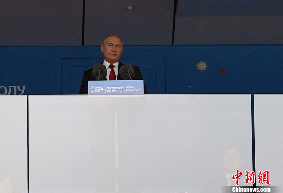 北京时间6月14日22点30分,俄罗斯世界杯开幕式在莫斯科卢日尼基体育场上演,这意味着四年一度的足球盛宴正式拉开帷幕。虽然开幕式表演时长不长但极具创意。开幕式结束后,北京时间23点,世界杯的揭幕战将也在这儿打响。在国际足联公布的俄罗斯世界杯开幕式表演嘉宾名单当中,除了有俄罗斯著名女高音歌唱家阿依达·嘉丽弗莉娜、英国著名流行歌手罗比·威廉姆斯外,还有两届世界杯冠军得主罗纳尔多。此外,在开幕式上,还将有1561人表演团队练习颠球,该项目有望突破吉尼斯纪录。图为俄罗斯总统普京出席开幕式。 中新社记者 毛建军 摄