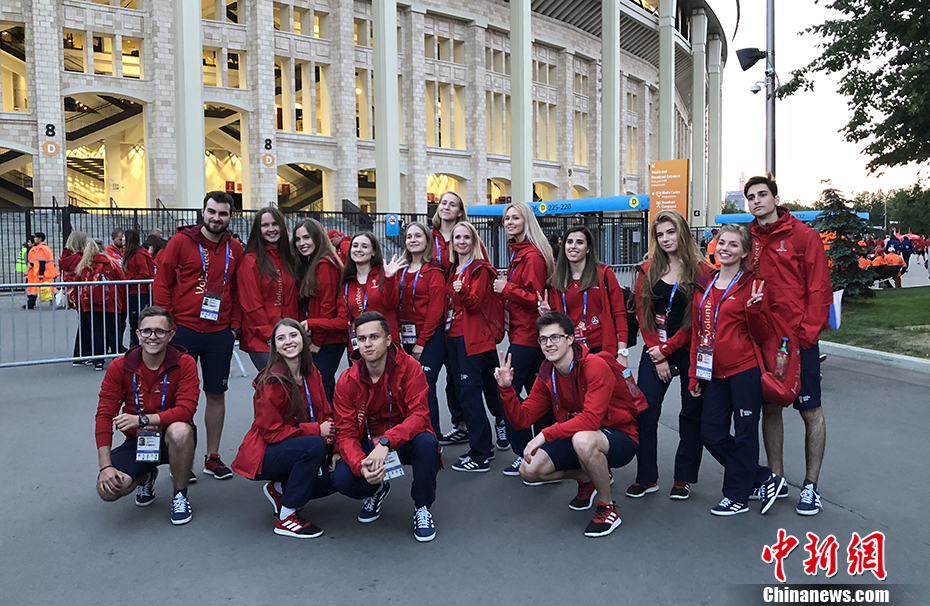 当地时间6月14日,俄罗斯世界杯揭幕战在莫斯科卢日尼基体育场结束,东道主俄罗斯5-0大比分击败沙特阿拉伯,赢得开门红。赛后,球迷走出球场,热情高涨。图为赛后合影的志愿者。 中新社记者 田博川 摄