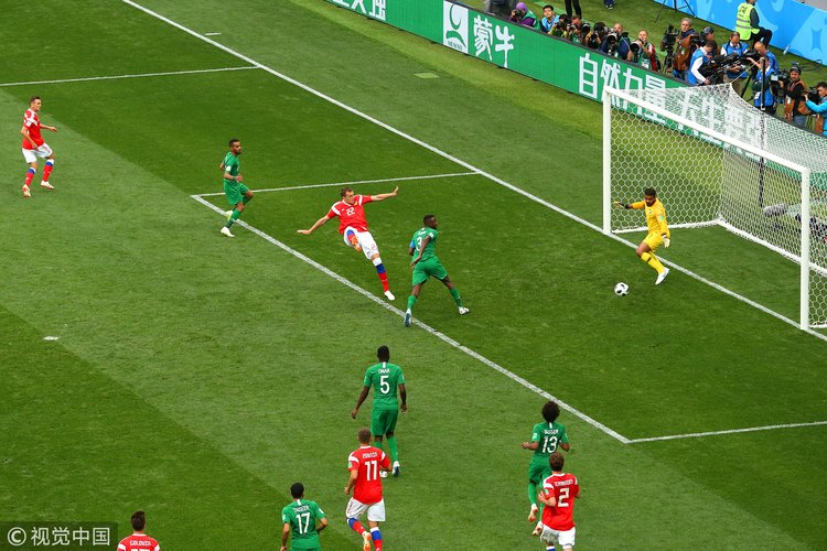 第95分钟,俄罗斯获得禁区前任意球,戈洛温主罚任意球直接打门,皮球越过人墙后擦着右侧立柱进入球门死角。最终,俄罗斯5-0取得开门红,沙特最近11场世界杯比赛不胜,而俄罗斯结束5场世界杯不胜的尴尬,并延续着东道主在世界杯首战不败(16胜6平)的纪录。