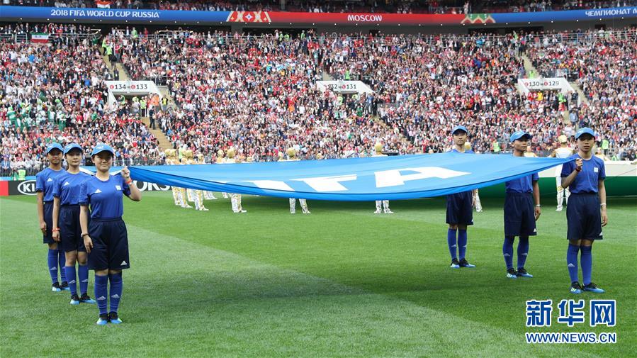 ↑6月14日,来自中国贵州黔东南苗族侗族自治州丹寨县的六位少年护送国际足联会旗入场。当日,俄罗斯世界杯揭幕战在莫斯科拉开战幕。赛前,来自中国贵州黔东南苗族侗族自治州丹寨县的六位少年护送国际足联会旗踏上体育场草坪,成为历史上首批担任世界杯护旗手的中国少年。 新华社记者杨磊摄