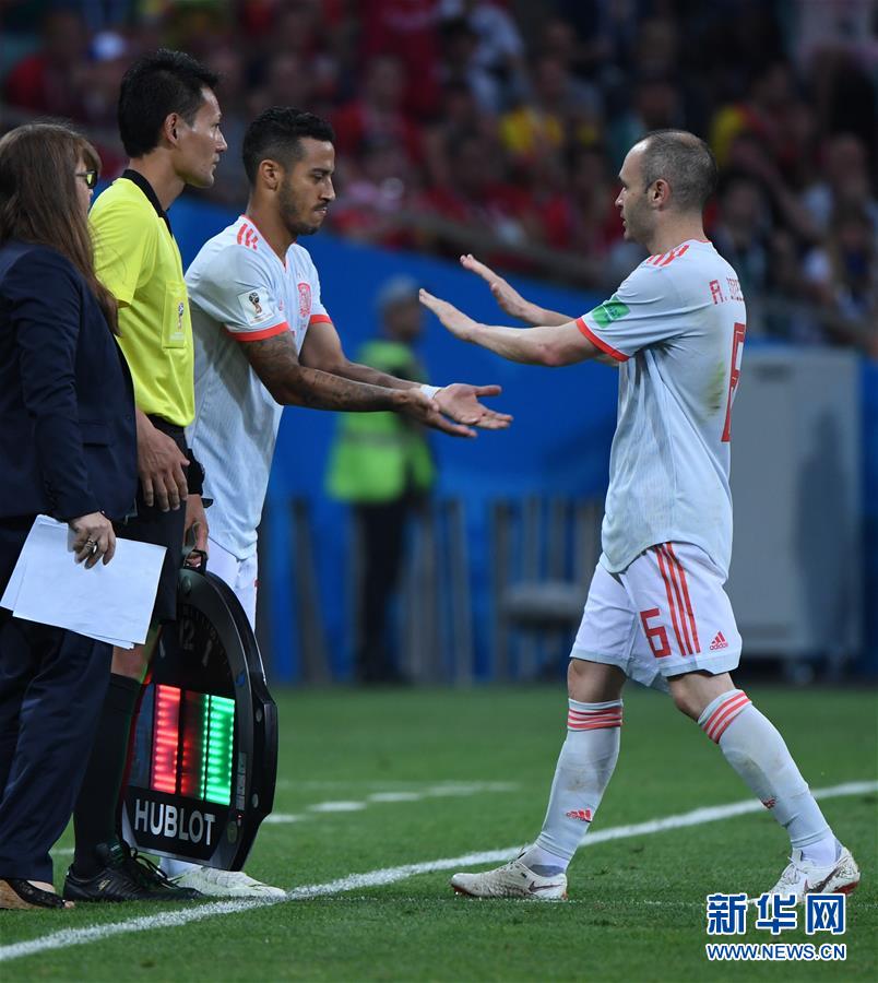 6月15日,西班牙队球员伊涅斯塔(右)在比赛中被替换下场。当日,在索契进行的2018俄罗斯世界杯足球赛B组小组赛中,葡萄牙队以3比3战平西班牙队。 新华社记者 李尕 摄