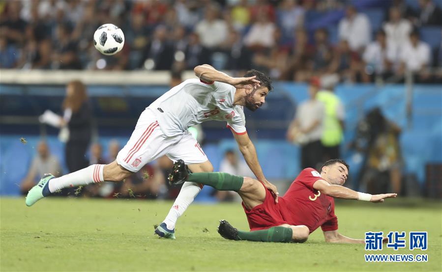 6月15日,西班牙队球员迭·科斯塔(左)与葡萄牙队球员佩佩在比赛中拼抢。当日,在索契进行的2018俄罗斯世界杯足球赛B组小组赛中,葡萄牙队以3比3战平西班牙队。 新华社记者 费茂华 摄