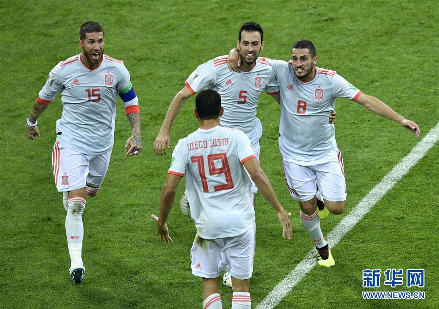 6月15日,西班牙队球员迭·科斯塔(前)在比赛中得分后与拉莫斯(左)、布斯克茨(右二)和科克庆祝。当日,在索契进行的2018俄罗斯世界杯足球赛B组小组赛中,葡萄牙队与西班牙队以3比3战平。 新华社记者 陈益宸 摄