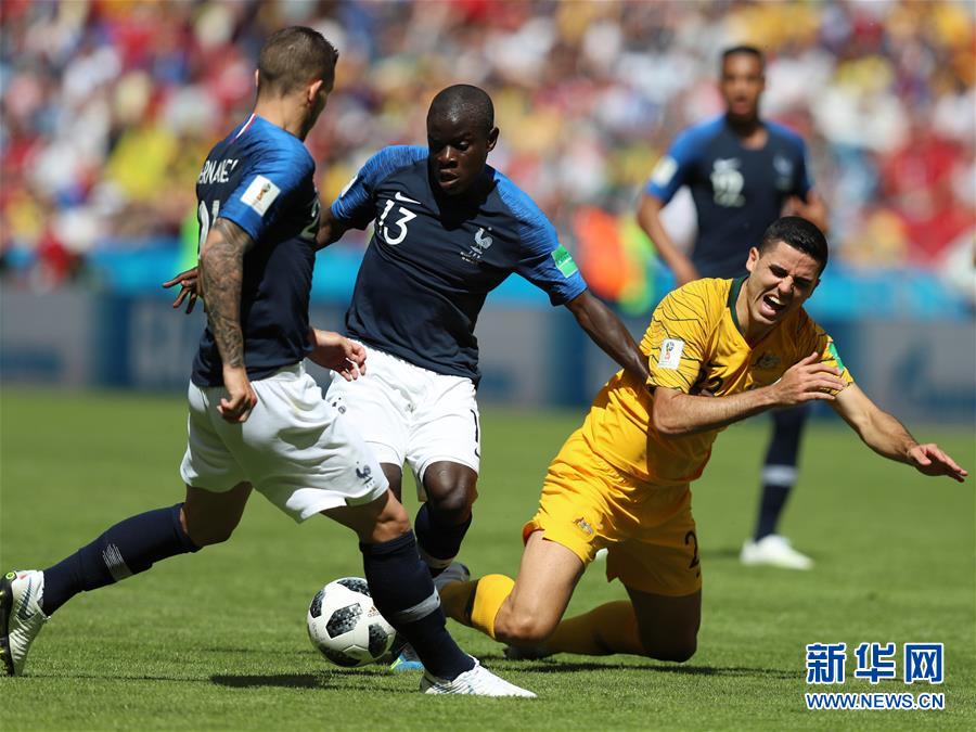 6月16日,法国队球员坎特(中)与澳大利亚队球员汤·罗吉奇(右)在比赛中拼抢。当日,在喀山进行的2018俄罗斯世界杯足球赛C组小组赛中,法国队2-1澳大利亚队。 新华社记者杨磊摄