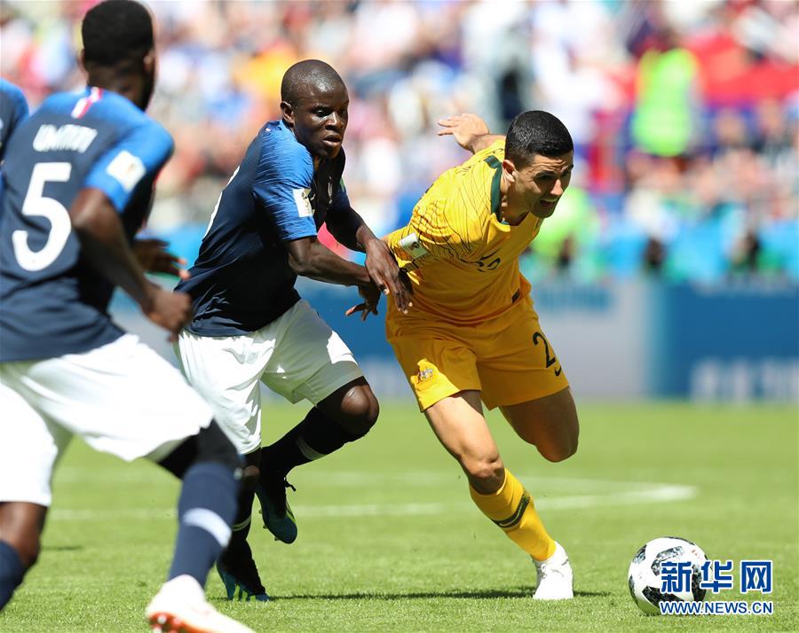 6月16日,法国队球员坎特(中)与澳大利亚队球员汤·罗吉奇(右)在比赛中拼抢。当日,在喀山进行的2018俄罗斯世界杯足球赛C组小组赛中,法国队2-1澳大利亚队。 新华社记者杨磊摄